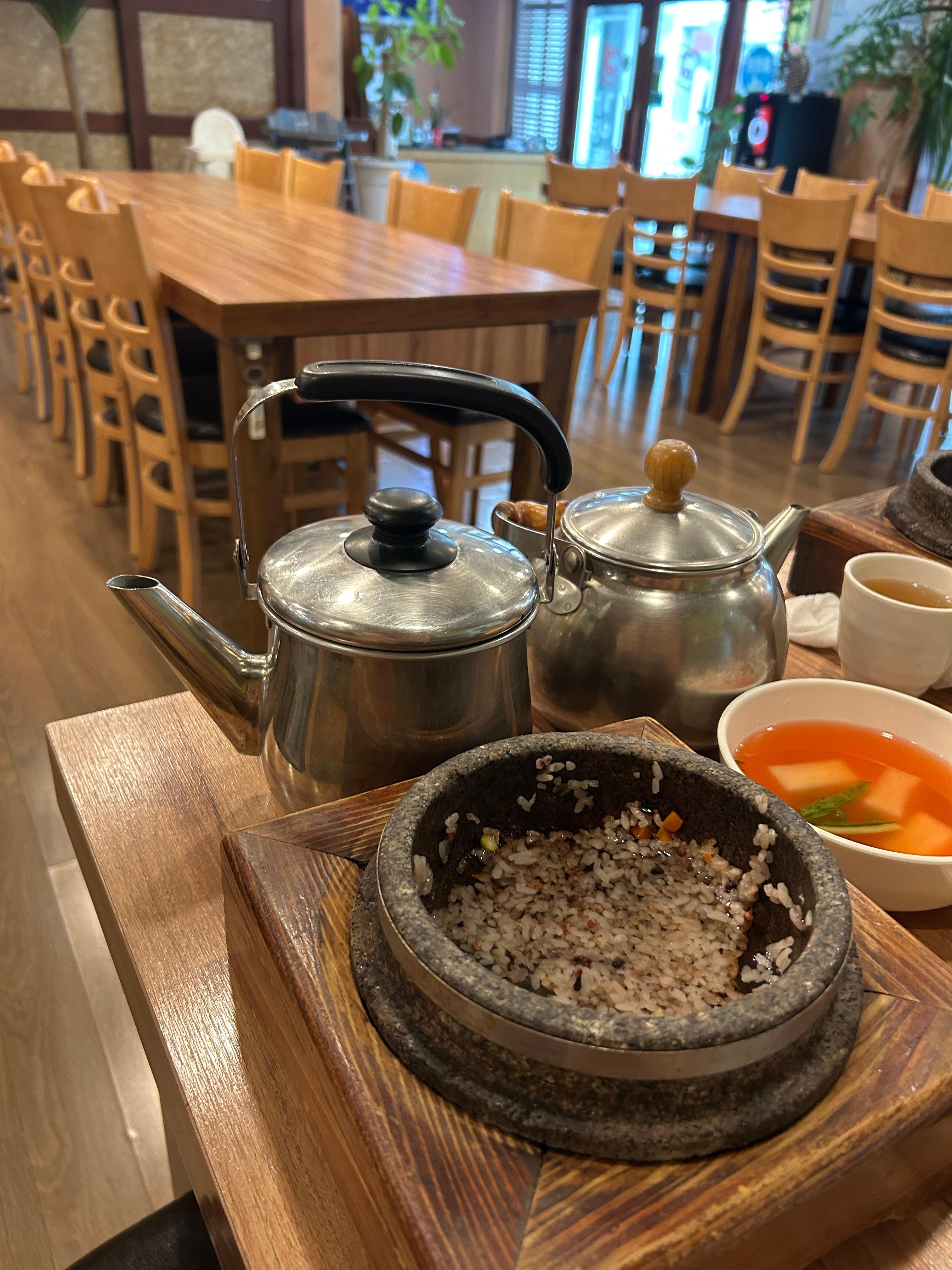 따뜻한 차도 나오는 양이 풍부한 돌솥밥~