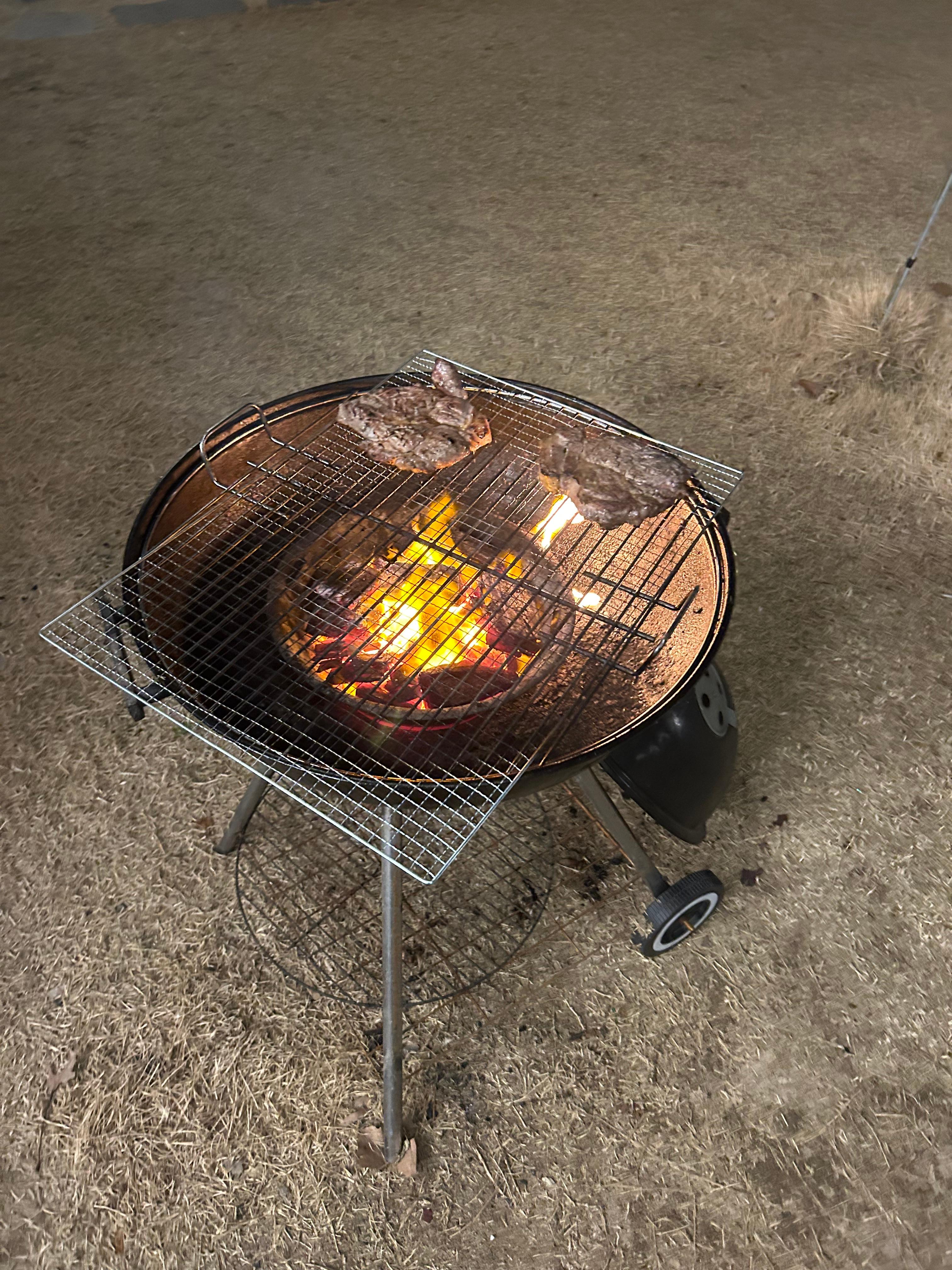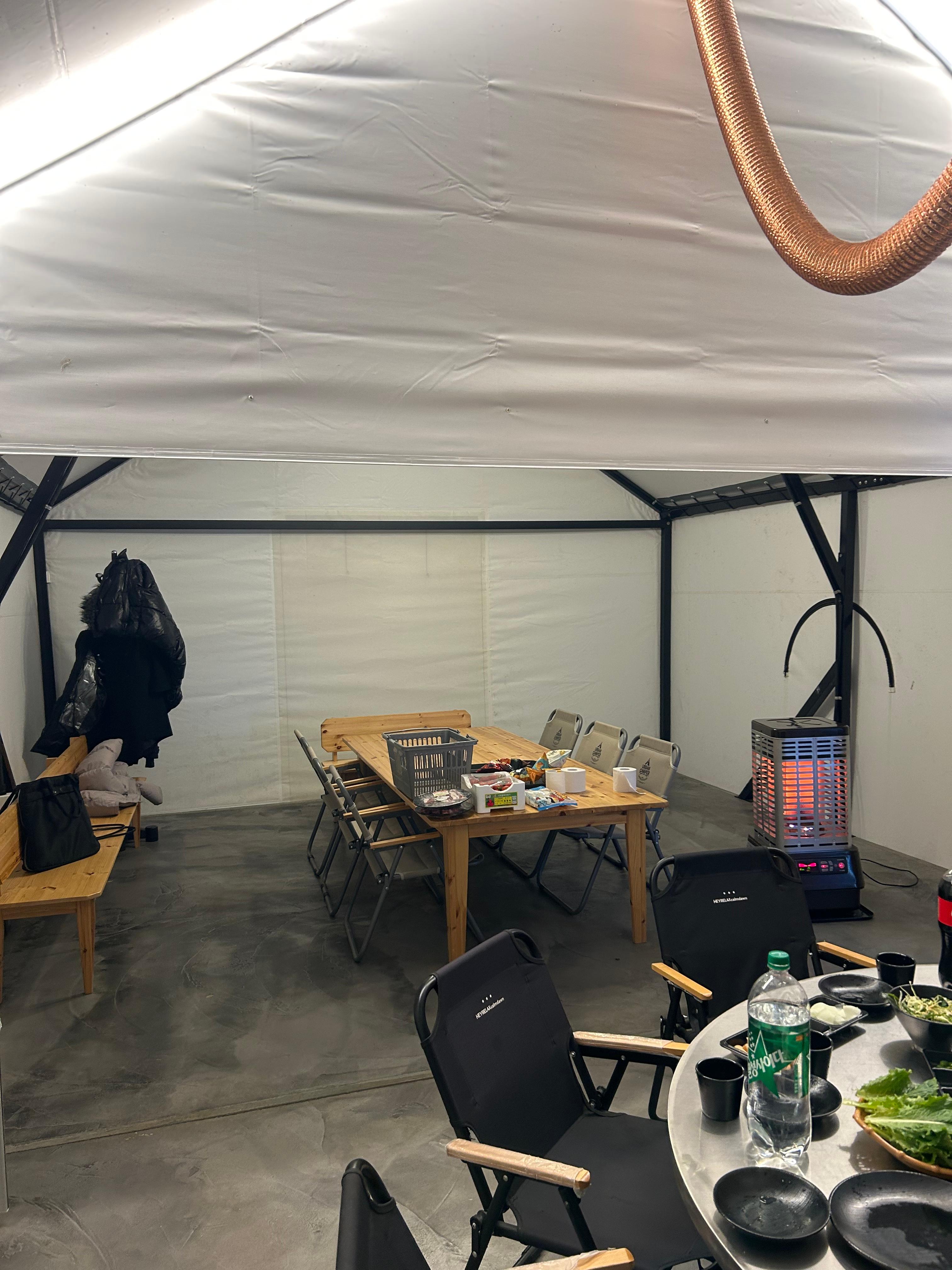 고기를 굽느라 텐트를 열긴 했지만, 자주 난로 앞에 돌아가며 서있어야했어요.