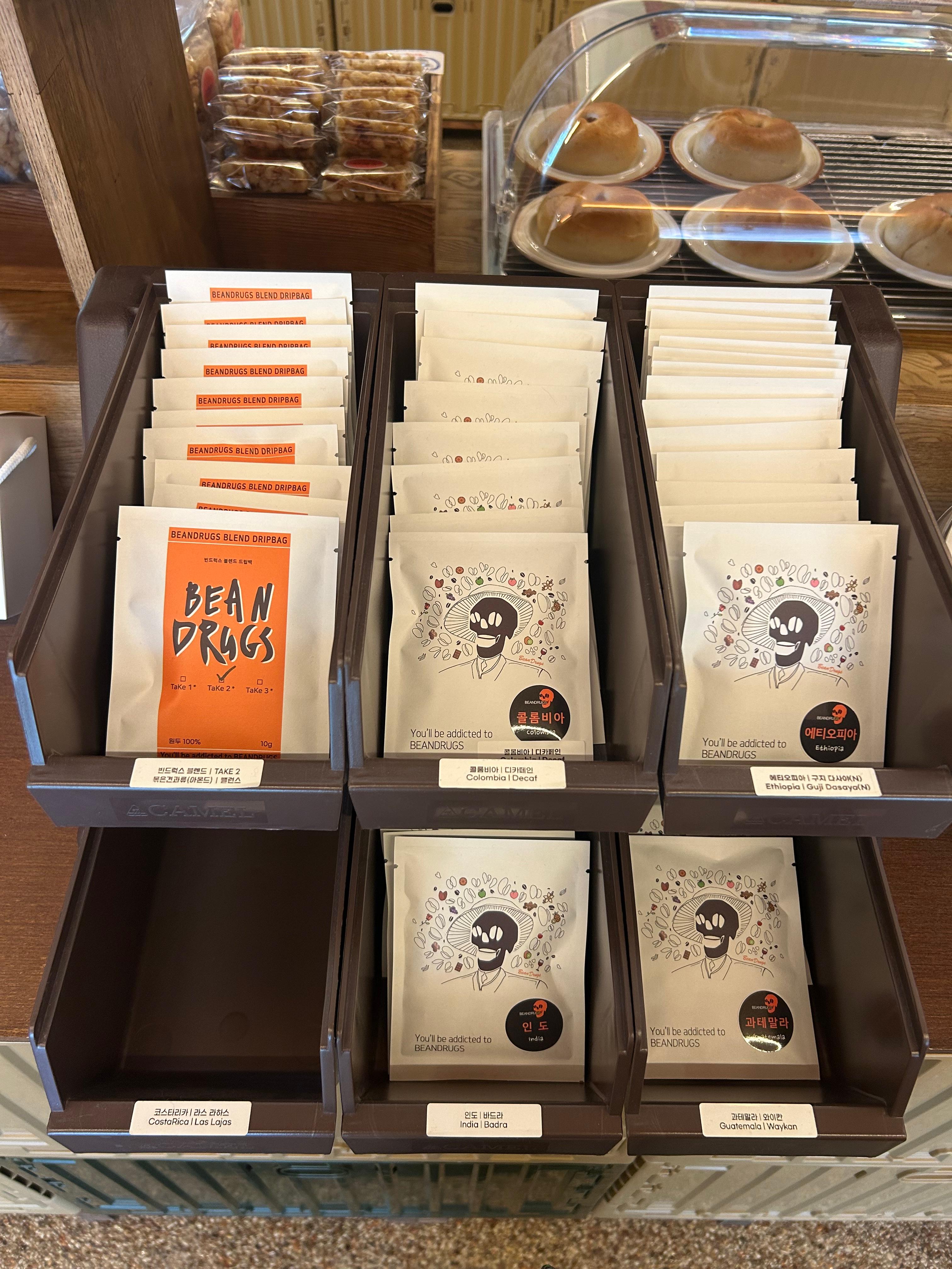 베이글 외에도 다양한 원두, 선물하기 좋은 상품들이 있어요.